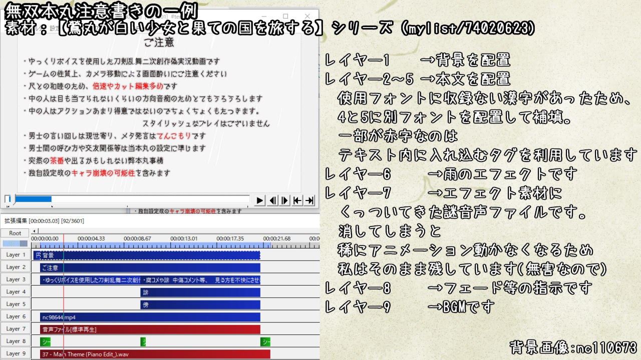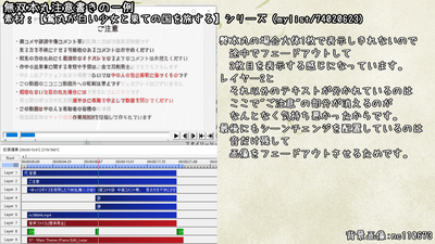 毎回これをやっていると動画も重くなりますし手間なので、私は一度注意書き部分のみを素材として書き出して(エンコードで画質が下がるので.aviで)各パートの冒頭にくっつけるようにしています。 マロ主様初めとした誰かのお役に立ちますように。